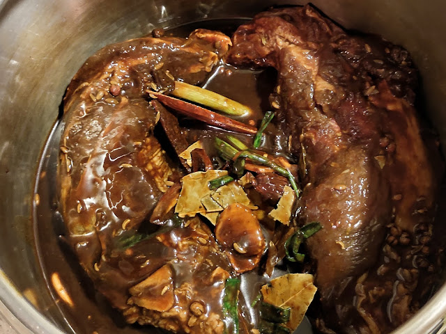 9) 因為上面的一舊牛腱煮好即食,雖然好食、有咬口,但筋膜還差少少未完全軟化。所以淨下的一舊牛腱再用壓力煲煮 10 分鐘,連醬汁放入雪櫃一晚,第二日食就更好食了。
